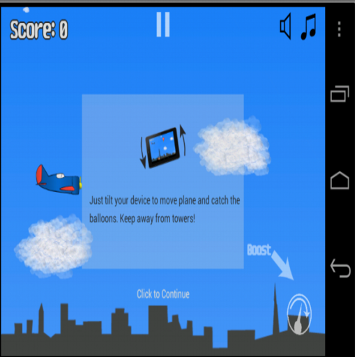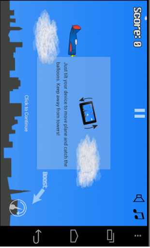scrolling game that uses the device accelerometer to control a plane. The aim of the player is to catch as many good items (balloons) as he can while keep away from dangerous items (bombs and towers)