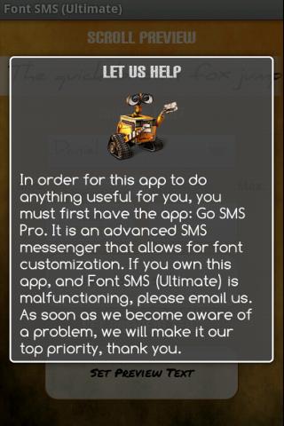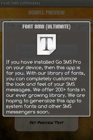 Font SMS (Ultimate) is the best font library available for Android. You can use these fonts in GO SMS Pro, Handcent SMS, Chomp SMS, GO Launcher and GO Keyboard. Use them to make your text messages, or phone in general, have that fun, customized feel. Currently, Font SMS (Ultimate) has 240 unique fonts, with hundreds more on the way!