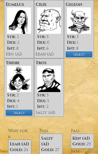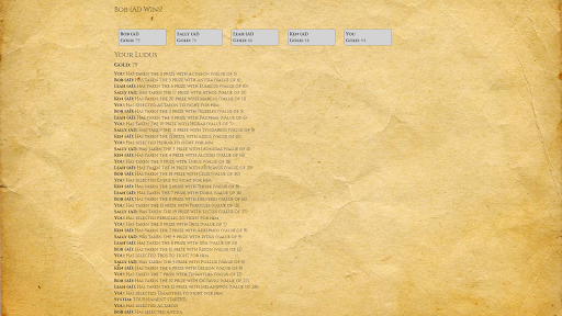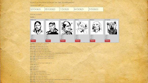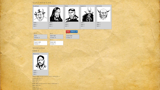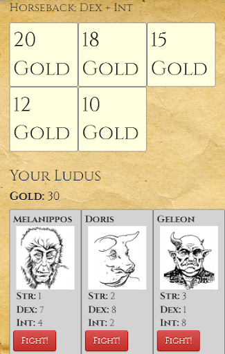 You are a lanista in ancient Rome, attempting to raise the status of your ludis by winning gladiatorial competitions. To win competitions, you need a good balance of gladiators that are Strong, Dexterous, and Intelligent. You must bid for gladiators, then Each competition will test a different combinations of skills.