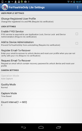 - Device Lock: Allows users to replace lock screen of Android by FYIO lock screen which require iris verification to unlock device.