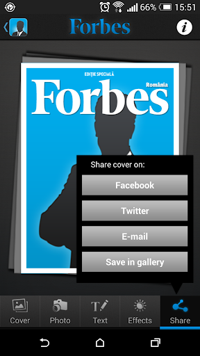 Tu poti fi pe urmatoarea coperta a revistei Forbes, cea mai cunoscuta revista de business si lifestyle din lume. Fa-ti o poza sau alege una din memoria telefonului, editeaz-o cu unul dintre filtrele noastre de imagine si incadreaz-o cat mai bine, alege titlul care ti se potriveste si trimite coperta prietenilor tai pe mail, posteaz-o pe wall-ul tau de Facebook sau salveaz-o in memoria telefonului pentru a le-o arata parintilor. Poti alege pe langa coperta Forbes Romania si copertile revistelor Forbes Life, Forbes Cars, Forbes Kids sau Forbes Woman.