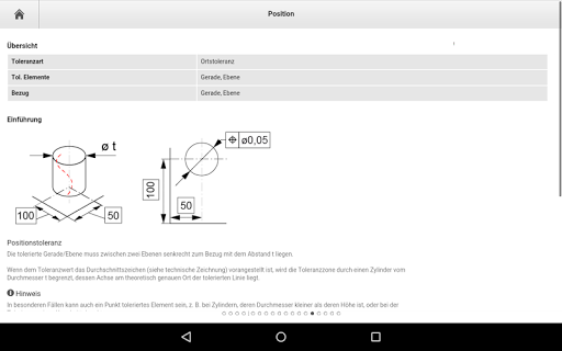 Diese App umfasst das breite Spektrum der Form- und Lagetolerierung und dient dem Ingenieur, Meister und Facharbeiter als multimediales Nachschlagewerk. In der betrieblichen Aus- und Weiterbildung veranschaulicht die App die Zusammenhänge und erleichtert so das Verständnis für die richtige Anwendung der Form- und Lagetoleranzen in der Praxis. In dieser App wird der normgerechte Einsatz von Form- und Lagetoleranzen erläutert und deren Interpretation an Beispielen aufgezeigt (Rundheit, Geradheit, Zylinderform/Zylindrizität, Ebenheit, Linienform, Flächenform, Position, Symmetrie, Koaxialität/Konzentrizität, Parallelität, Rechtwinkligkeit, Neigung, Planlauf/Rundlauf, Gesamtplanlauf/Gesamtrundlauf).