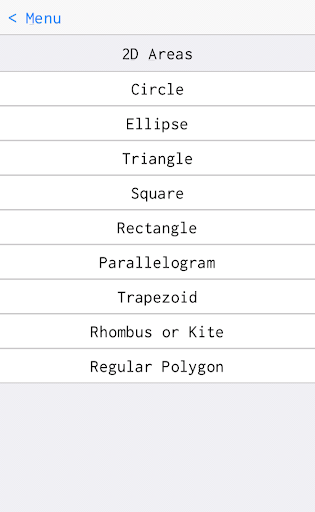 •Area of 2D Shapes (Circles, Ellipses, Triangles, Squares, Rectangles, Parallelograms, Trapezoids, Rhombuses, Kites, Regular Polygons)