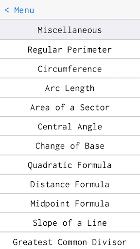 •Miscellaneous (Regular Perimeter, Circumference, Arc Length, Area of a Sector, Central Angle, Change of Base, Quadratic Formula, Distance Formula, Midpoint Formula, Slope of a Line, Greatest Common Divisor, Least Common Multiple)