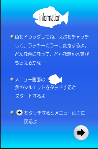 魚が落ちてくるえさをチャッチするとラッキーカラーと褒め言葉がもらえる。