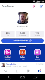 • Follow people and influencers whose tastes you trust, and their tips show first. Connect your Facebook and twitter accounts and see spots your friends have liked nearby.