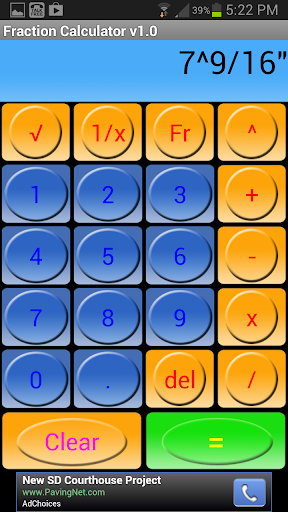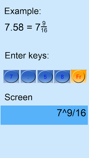Handymen use tape measure frequently on the job site. A standard tape measure is marked in 1/16 inch divisions. Construction calculations often result in decimal numbers. In order to use the result with a tape measure, a handyman would do the conversion in his/her head by experience. It's a tedious task. With Fraction Calculator, you can simply enter the decimal number and press the Fr key on the keypad. This application software converts the decimal number into feet, inches and a simplified fraction in 1/16 inches for you, ready to use on a standard tape measure. All in a fraction of a second :-)