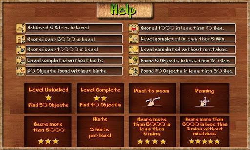Each level features 10 distinct achievements to unlock (100 in total for the app), and 40 meticulously well-hidden objects to find (400 in total for the app).