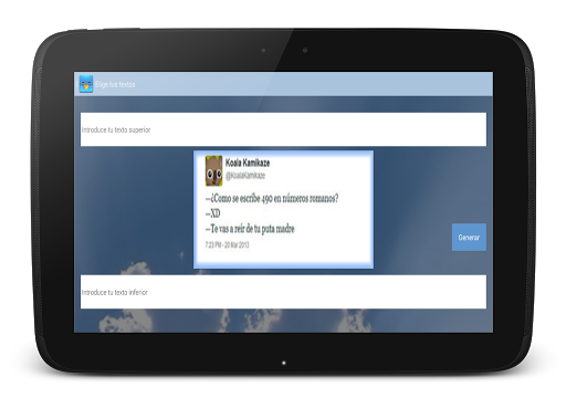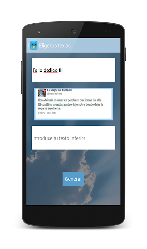 Personaliza las frases graciosas y tweets con tus propias frases y comparte imágenes con tus frases más originales. Alegra el día a tus amigos de una forma diferente. Empieza un nuevo día de la manera más original.