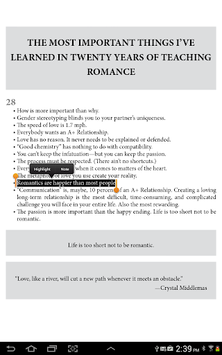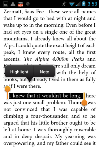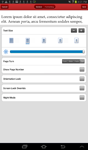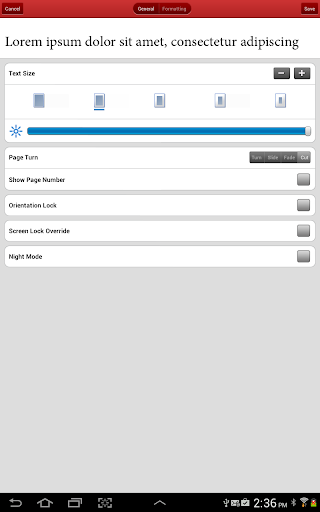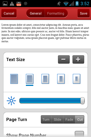 The Freading application includes many features that you would expect for a good reading experience such as tap or swipe to turn pages, remembering the last page read, and selectable text size.