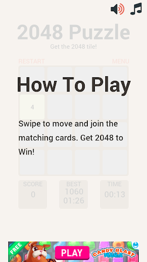 Swipe (Up, Down, Left, Right) to move the tiles. When two tiles with the same number touch, they merge into one. When 2048 tile is created, you wins!