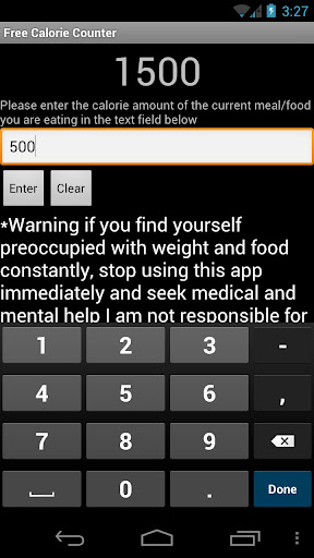 Ever wanted to start dieting but never new when to begin. Well it starts here with the free calorie counter with no ads. It has a score at the top which is the 2000 calories you should eat a day. Below is a text field where you enter the calorie amount of the food or meal you are currently eat and hit enter and the score will decrease to show how many calories left you should eat.
