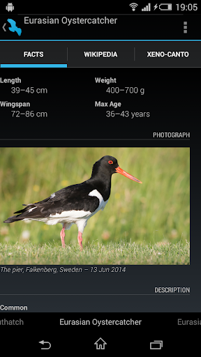 – View the facts tab with basic bird data, photographs, descriptions, paintings and up to date systematics in the supported languages.