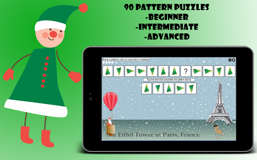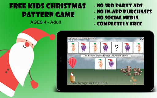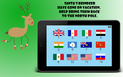 WHERE: Santa is traveling all over the world--England, France, Italy, Egypt, India, Antartica, Russia, Mexico, USA and the North Pole. This app provides some exposure to world geography with flags and famous landmarks.