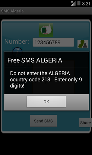 This free SMS to Algeria app only provides capability to send SMS to Algeria. This app cannot receive SMS. To receive SMS as reply include your own reply mobile number as part of this free Algeria SMS sent.