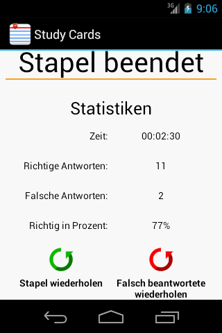 • Wiederholen des kompletten Stapels, oder nur falsch beantwortete Karteikarten
