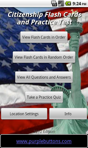 Use this app to learn the answers for all the questions and actually practice the USCIS Citizenship Civics Test. Features flash cards for all 100 questions. View them in a random order, or the order presented in the USCIS documentation. Take a practice test and see if you can score well enough to pass the actual Interview Test.