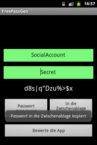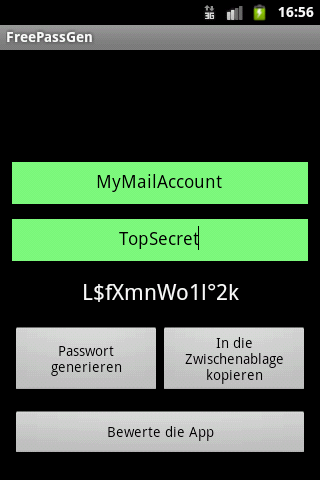 FreePassGen generiert aus zwei Schlüsseln ein mindestens 12 stelliges kryptisches Passwort. Der erste Schlüssel kann beispielsweise der Name des Online-Kontos sein, der zweite geheime Schlüssel ist sozusagen das Masterpasswort. Vorteil: kryptische Passwörter können aus einfach zu merkenden Schlüsseln erzeugt werden. Außerdem werden die Passwörter nicht elektronisch gespeichert und können somit auch nicht geklaut werden.