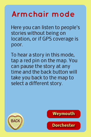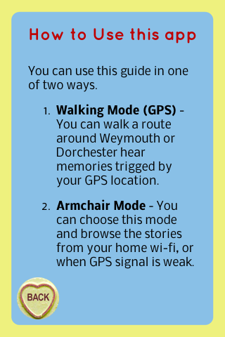 1. Walking Mode (GPS) - You can walk a route around Weymouth or Dorchester hear memories trigged by your GPS location.