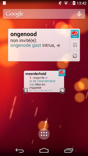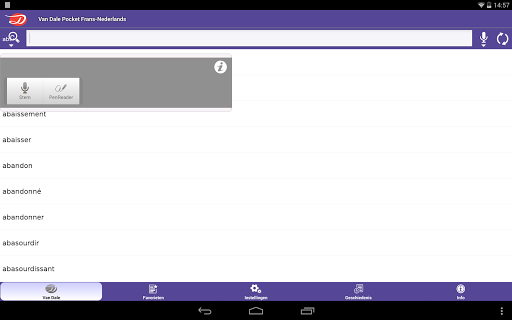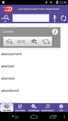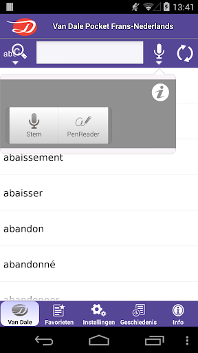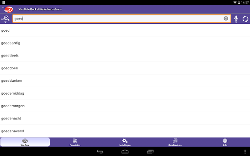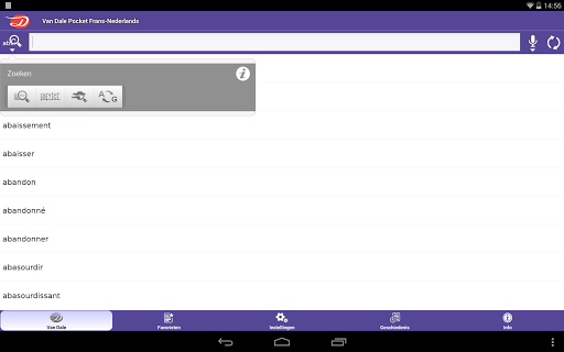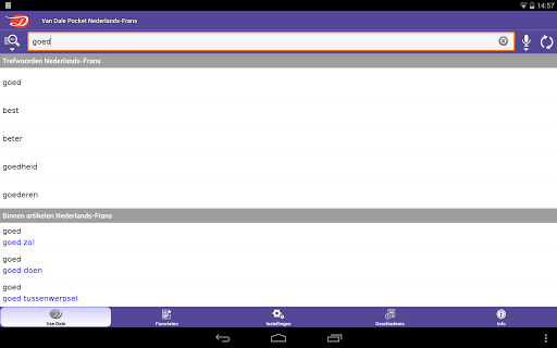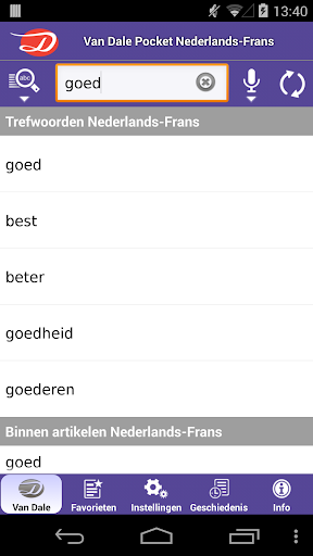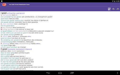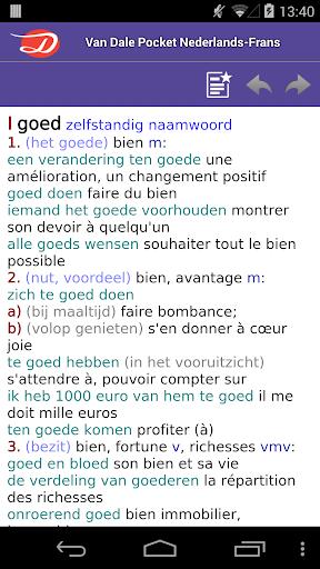 NB: This concise dictionary contains 51,913 entries, specially selected according to user frequency. It is intended for Dutch users. The app content is comparable to the combined content of Van Dale’s printed Dutch-French and French-Dutch Pocket Dictionaries.