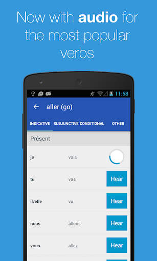 Now with audio!! Not sure how to pronounce a verb? Listen to the 50 most commonly used French verbs, as spoken by a native French speaker. Just tap on the button next to the conjugation. Verbs with audio have a speaker symbol next to them. Note: this functionality requires an Internet connection.