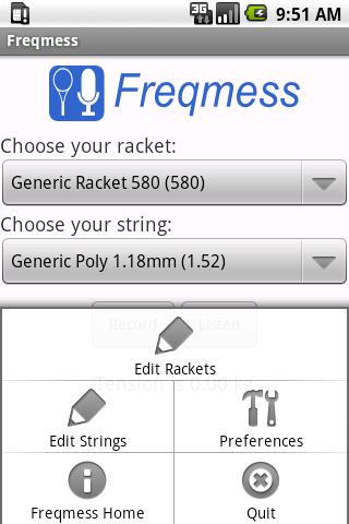 With Freqmess you can measure the tension of the strings on your tennis racket. It makes use of the microphone to record the sound of the swinging string bed to calculate the tension. Just choose your setup, pluck the strings of your racket and hit the Record button.