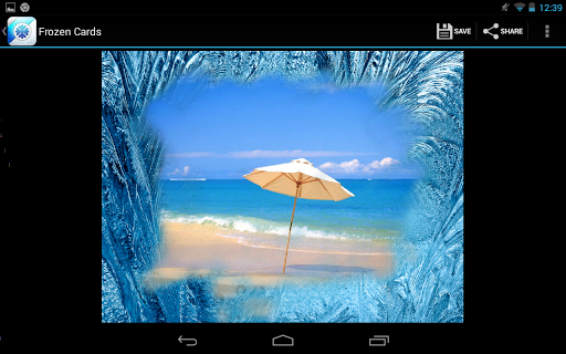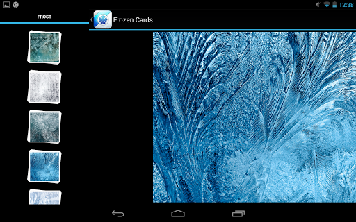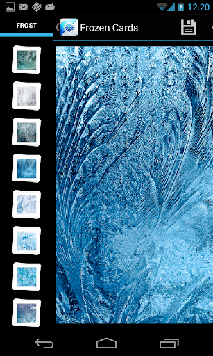 Frozen Cards is a tiny straightforward app that combines a photo effect and a mini game. What it does is covers your photos with feathery patterns of frost, as found on windows on winter mornings. You can then thaw your screen with a touch! We worked hard to make this effect as realistic as possible. The longer you press your finger against the screen, the more intensely frost will thaw. Or you can use broad strokes across the screen to clear it in thin swaths. While mixing these techniques you can eventually draw whole pictures on your screen or just emphasize some detail on the photo under the ice. It's a perfect app for hot summer days that makes you to feel frosty.