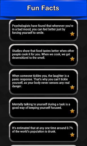 Are you looking for the best collection of Fun Facts for your mobile device? This app is filled with the most fun facts for kids, about animals, about earth, food, and more. True random fun facts that you might find crazy and won't believe! Entertain your friends and family with a fun fact of the day, funny and weird, these facts are sure to put a smile on your face. If you want something to talk about, pull out your phone and read a new fun fact that everyone can enjoy. Download and install this free fun facts app and learn something new every day!