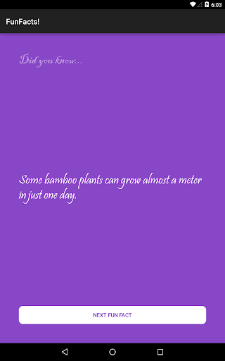 Fun and interesting facts at the tap of a button! Here's your first interesting Fact: you can also learn how to make this app and much more complicated apps than this at Treehouse by visiting http://referrals.trhou.se/kumarbharathhassannarasimhamurthy and get 50% off the subscription on your 1st month !!! hurry up and start learning and make your 1st app !