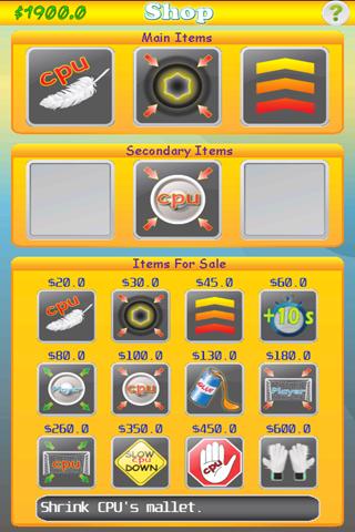 In two play mode, you can collect items in game by hitting them by your mallet. In free version, only the player use any item first can use items continuously. In paid version both player can use items freely.