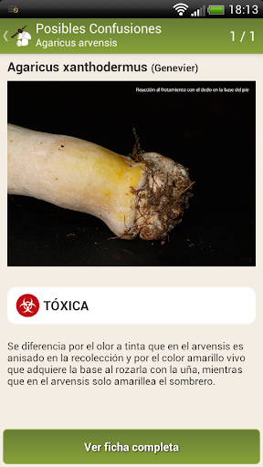 Aunque SIEMPRE es imprescindible consultar con un experto antes de consumir cualquier especie que no conozcamos, si realizas salidas al monte a recolectar hongos para su consumo, la aplicación FUNGIPEDIA te permitirá descartar muchos de ellos directamente en el campo, de forma que no recolectes ejemplares innecesarios, permitiendo que sigan cumpliendo con sus funciones esenciales en la naturaleza y evitando intoxicaciones. Para ello, encontrarás en la ficha de las especies comestibles más comunes un botón de confusiones que te mostrará cuales son las especies más peligrosas con las que se suele confundir dicha especie comestible.
