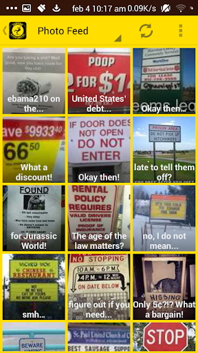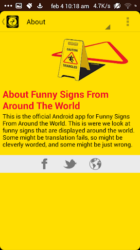 This is the official Android app for Funny Signs From Around the World (http://www.funnysignsfromaroundtheworld.net). This is were we look at funny signs that are displayed around the world. Some might be translation fails, so might be cleverly worded, and some might be just wrong.
