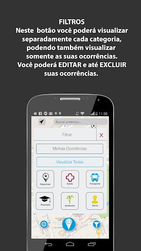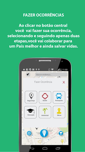 8- Buscar endereço; 9- Filtrar a visualização dos pinos que deseja visualizar no mapa; 10- Apoiar ou Não Apoiar as ocorrências; 11- Quando você faz uma ocorrência ela é enviada para Autoridades Federais (Ministério Público Federal, Polícia Federal, TCU e outros);