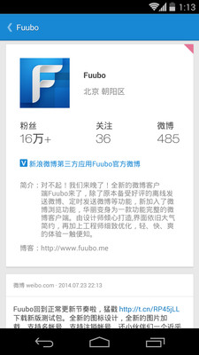 对不起!我们来晚了!全新的微博客户端Fuubo来了,除了原本备受好评的离线发送微博、定时发送微博等功能,新加入了微博浏览功能,华丽变身为一款功能完整的微博客户端。由设计师倾心打造,界面依旧大气简约,再加上工程师细致优化,轻、快、爽的体验一触便知。