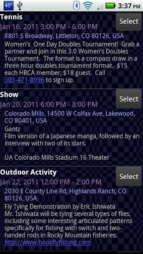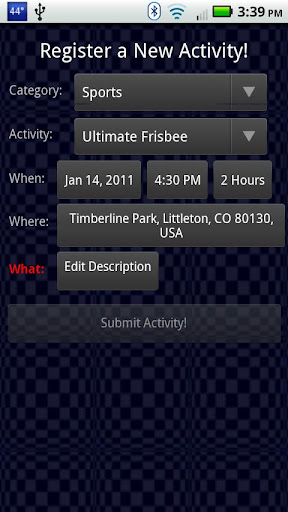 BTW if you're wondering about permissions: Internet, because all the data's on a server; Location, so you don't have to type in where you are all the time, Phone State, because it uses your phone's hardware ID code to identify which activities are yours so you can edit them if you want. That's all.