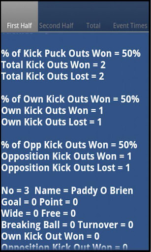 This application lets the user record realtime player and team statsistics for a GAA Football match. The application can record up to 30 players statistics per match.