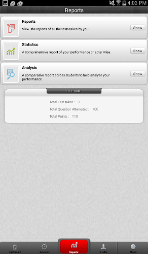 • Gives a comprehensive report of your performance chapter wise to help you assess yourself