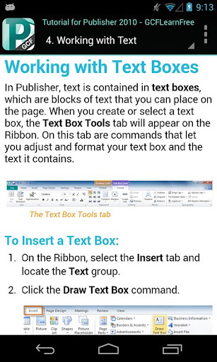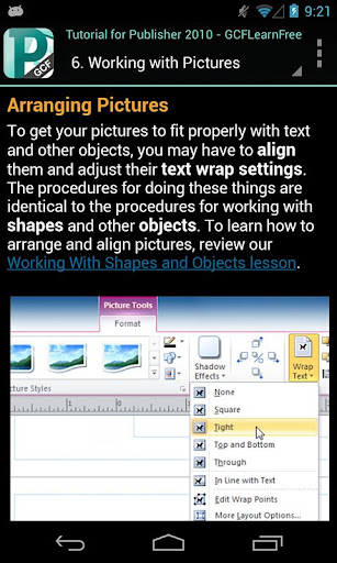 Based on the popular tutorials available at GCFLearnFree.org, the GCF Publisher 2010 Tutorial app guides you through the updates of Microsoft Publisher 2010. The app explores program basics and common tasks and delves even deeper to work with more complex features. Instructional step-by-step text is accompanied by graphics and videos. Whether you are new to Publisher or have used it for years, everyone will learn something new in this guide.