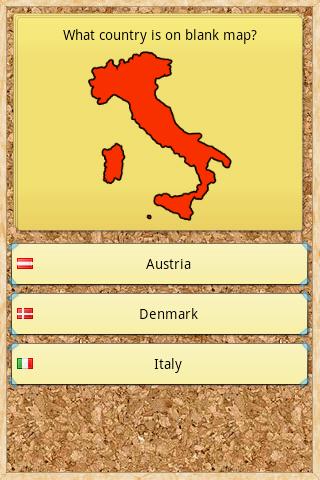 There are currently three types of quiz available in this game. The first one is guessing countries according their flags, the second one is guessing countries according their blank maps and the last one is guessing capital cities.