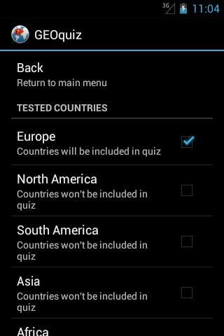 There are 173 countries in this application. You can change a few settings in menu. It is possible to test only countries from specific area. It is also possible to change number of questions in every single quiz.