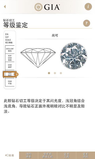 GIA 4C应用程序利用视频和互动工具向消费者演示GIA是如何对钻石的颜色、切工、净度和克拉重量进行鉴定的。此应用程序解释了GIA的D到Z颜色等级及其对钻石价值的影响、GIA净度等级及其对钻石价值的影响、影响钻石切工等级的因素,及克拉重量系统的起源。