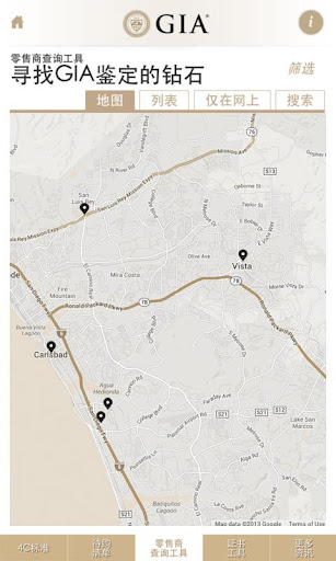 • 零售商查询工具可让消费者找到销售GIA鉴定的钻石和/或有GIA培训的员工的零售商。查询: