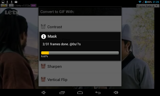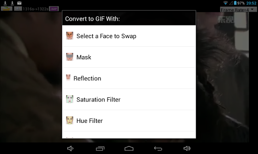 After both ends of the extract are marked, press "GIF" button (the 3rd icon from the left top on the first image) to create GIF animation, and LONG press "GIF" button to show more options on a menu with the following items: