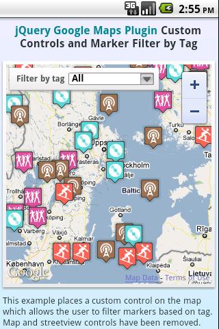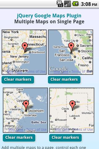 jQuery Mobile and UI developers will love the Google Map examples in this demo app: