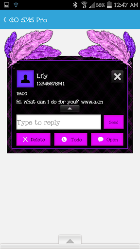 -Custom Font Colors (if you do not like the font color that the themes comes with, you can customize the theme font and font colors in the settings menu under the "advanced" tab in Go SMS Pro. This can be done with ANY Go SMS Pro theme).