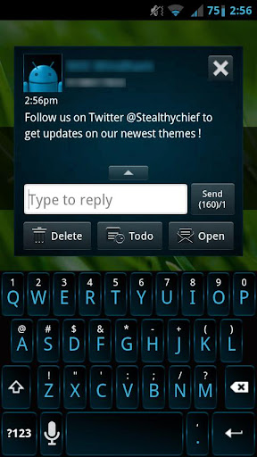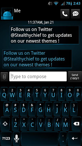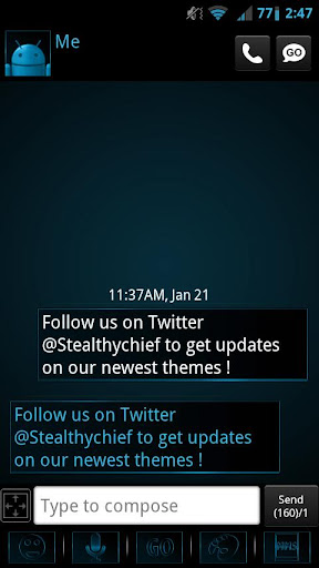 This GO SMS theme features a dark design with colors of black and ics blue. Perfect for users of black and ics themes!