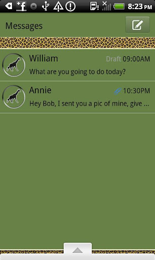 This jungle go sms theme has a cheetah print background. The pop up box has a green background with a lion at the top. The chat bubbles have leaves on them.
