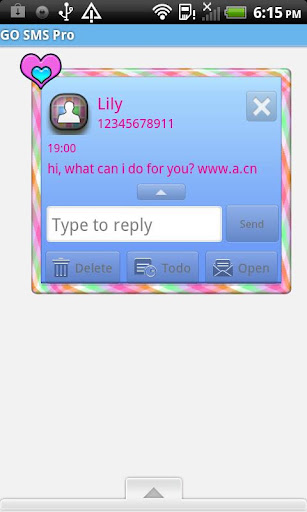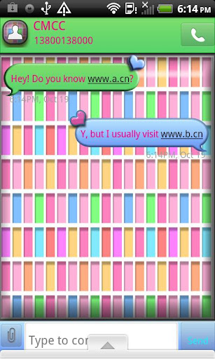 This pastel hearts go sms theme has a chat room background in pastel pink, blue and green. The chat room bubbles have hearts on them.