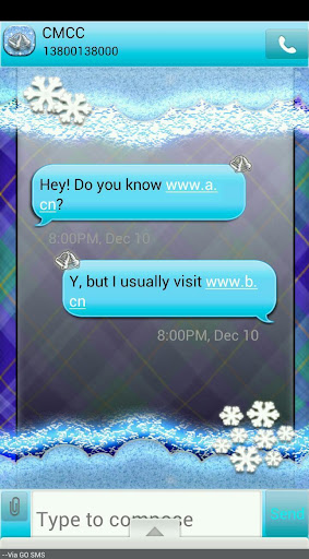 This sleigh bells go sms theme is a beautiful Christmas theme with the background in blue and purple plaid. The top and bottom have snow clouds and snow flakes. The pop up box has white bells on it. It is so pretty!