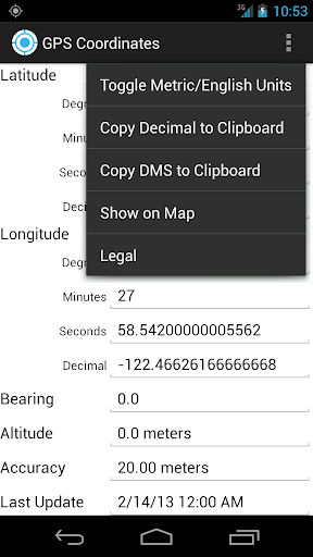 A simple GPS coordinate utility that displays your current location in Degree / Minutes / Seconds (DMS) and decimal formats. Altitude and bearing (while in motion) information is displayed as well. You can copy GPS coordinates to the clipboard in either DMS or decimal formats for pasting in map applications, documents, chats, or emails. This app is great for geocaching and field work / testing that requires real-time GPS coordinates.
